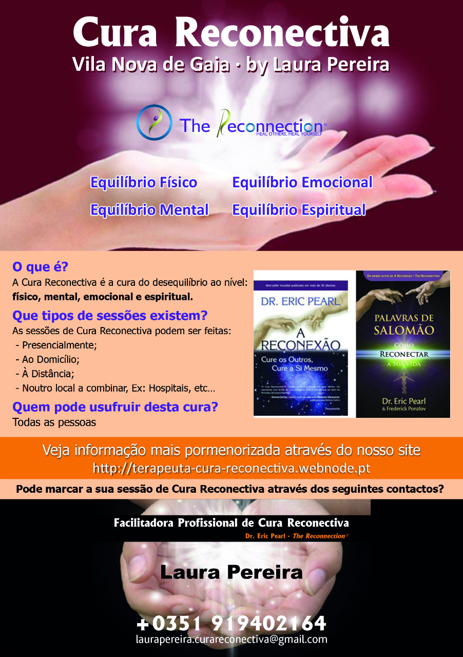 ATENÇÃO! Dr. Eric Pearl, The Reconnection, LLC, e qualquer pessoa associada a este trabalho, incluindo Laura Pereira, mas não se limitando a The Reconnection® e/ou Reconnective Healing® não fazem nenhuma reivindicação, promessas, representações ou garantias e não oferecem nem o diagnóstico nem tratamento específico aos desafios de saúde. Você é o único responsável por cuidar-se e para continuar com o seu próprio tratamento e cuidados médicos. Ao solicitar e realizar sua sessão você confirma que entende e concorda integralmente com todo o exposto na NOTA LEGAL